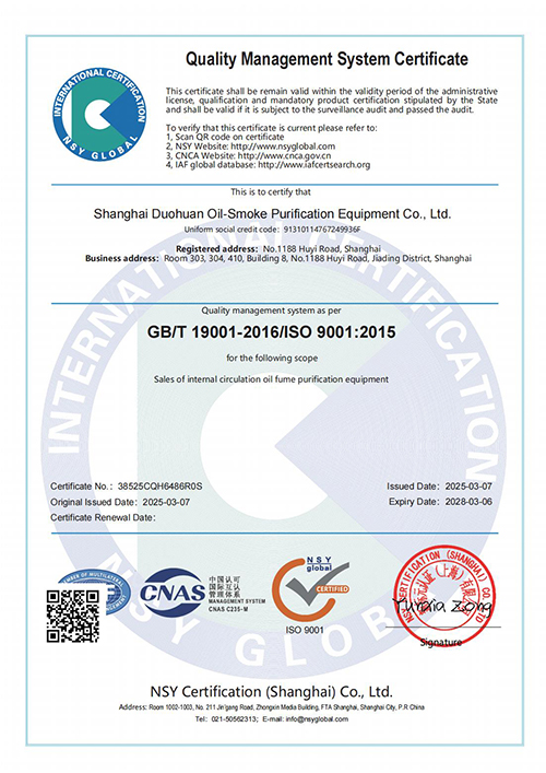 ISO9001認證 是全球公認的質(zhì)量管理標準,它代表著國際社會對上海多環(huán)油煙凈化設(shè)備有限公司產(chǎn)品質(zhì)量的認可,也標志著多環(huán)公司在規(guī)范化、標準化、國際化的道路上邁出了堅實的一步。